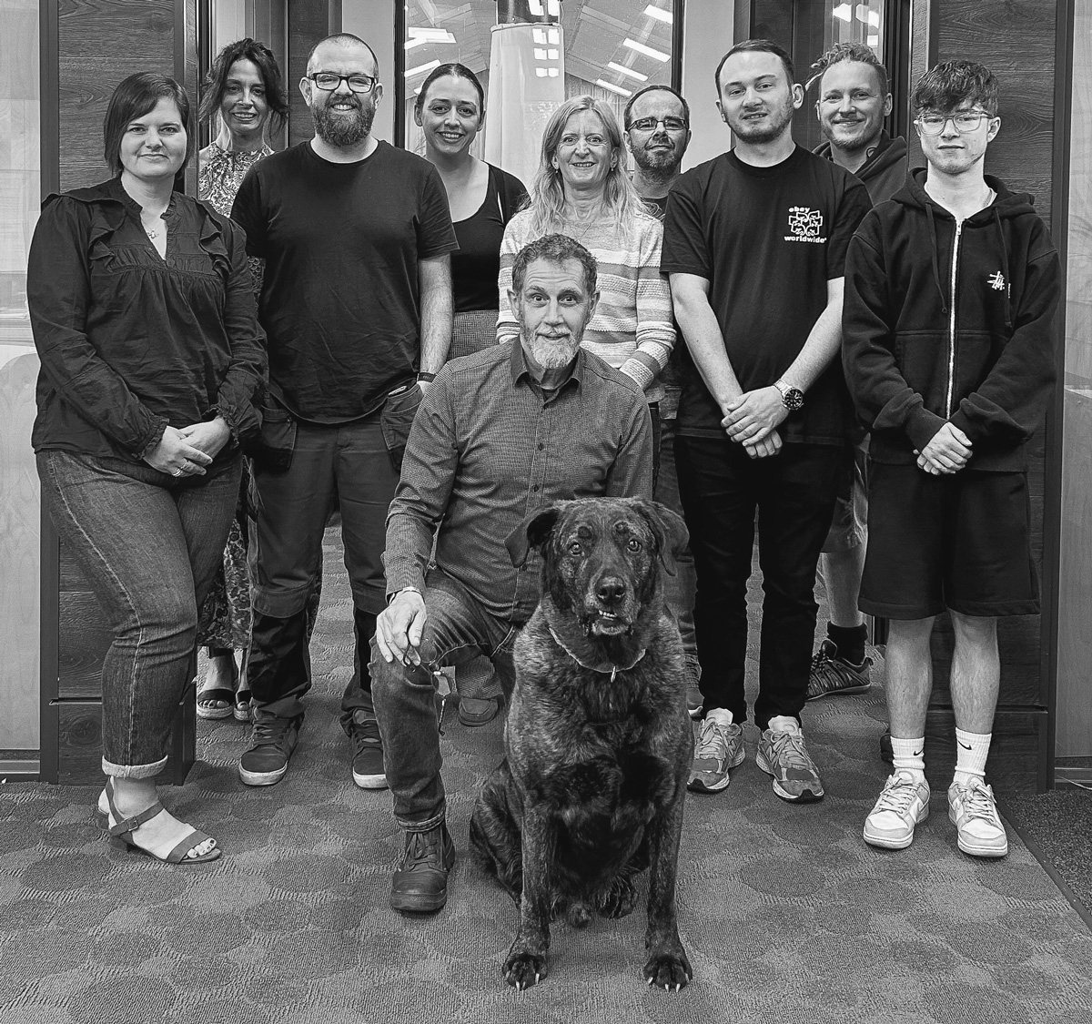 Ci-dessus : une photo de groupe de certains membres de l'équipe Absolute, prise dans les bureaux d'Absolute, avec Sam Sprague en bas au centre, avec son chien et chef du moral du bureau, Rhino.
