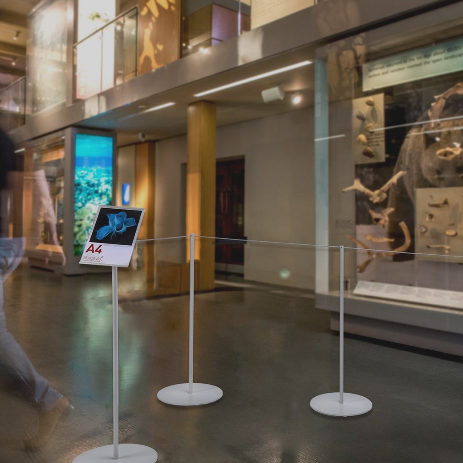 Si une exposition invite les visiteurs à prêter attention au son, aux matériaux et à l’atmosphère, les outils utilisés pour gérer la circulation doivent être en accord avec cette ambition. Le même principe s’applique à la signalétique. Les stands d’information, les panneaux de signalisation et les solutions d’étiquetage discrètes contribuent à renforcer le parcours, à expliquer les changements temporaires et à répondre aux questions pratiques avant que l’intervention du personnel ne soit nécessaire. Utilisés efficacement, ils réduisent les hésitations et rendent l’expérience globale plus sereine.