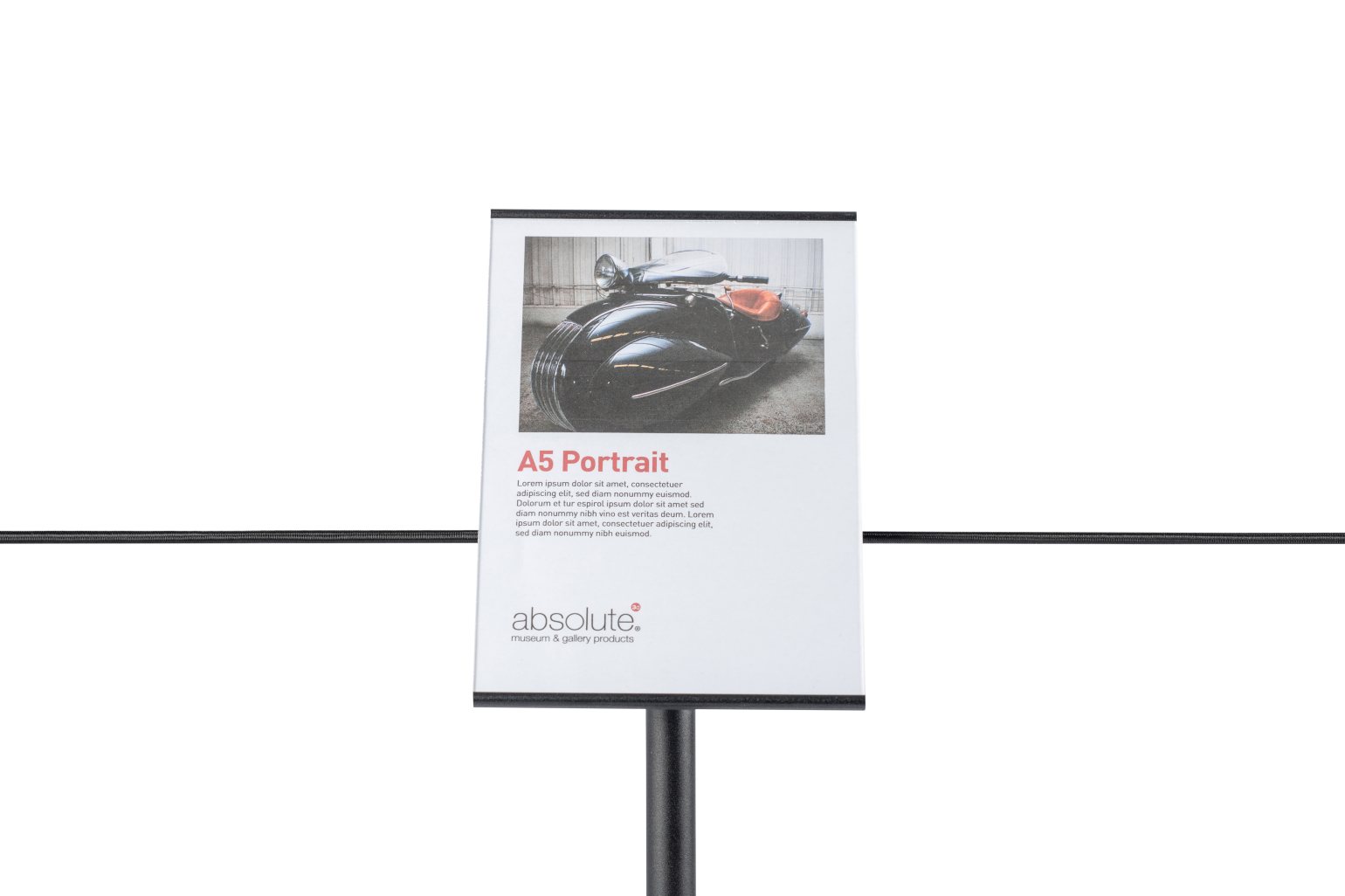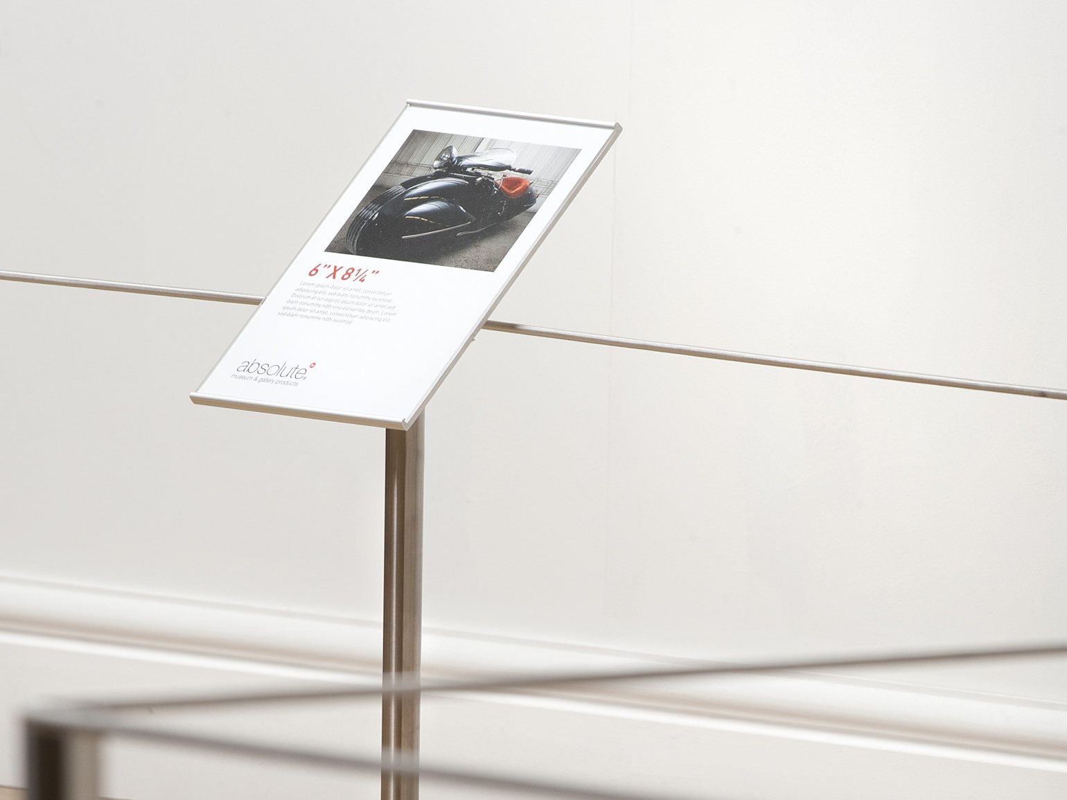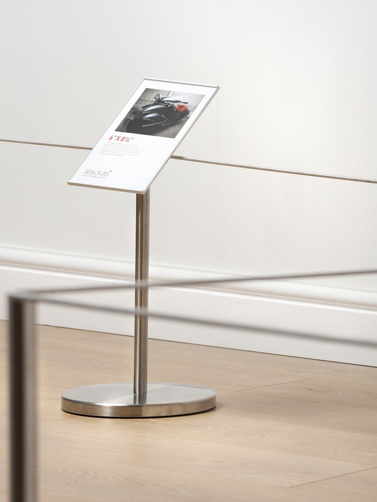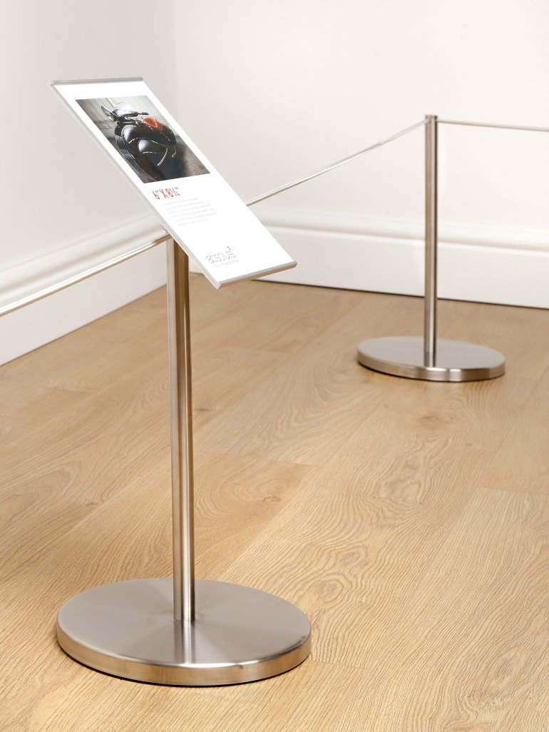 Les systèmes de barrières de protection Absolute sont conçus pour être reconfigurés en fonction des besoins de l'exposition. Les barrières plus minces, souvent utilisées dans les présentations d'objets, peuvent supporter des étiquettes de différentes tailles à l'aide d'un adaptateur facile à utiliser, particulièrement utile lorsque le contenu explicatif doit être placé à proximité immédiate de l'objet, mais qu'un montage mural n'est pas possible ou souhaitable.Pour les zones à forte fréquentation, les barrières Q sont conçues pour fonctionner avec des plaques de signalisation plus grandes (A4 ou A3), maintenues en place par des adaptateurs fermés qui empêchent toute interférence ou tout déplacement accidentel. Les plaques peuvent afficher des informations d'orientation ou des notes de conservation, sans interrompre le système de cordons de barrière.