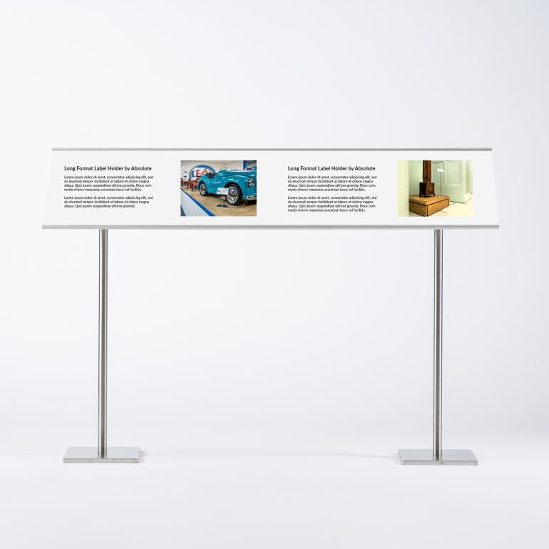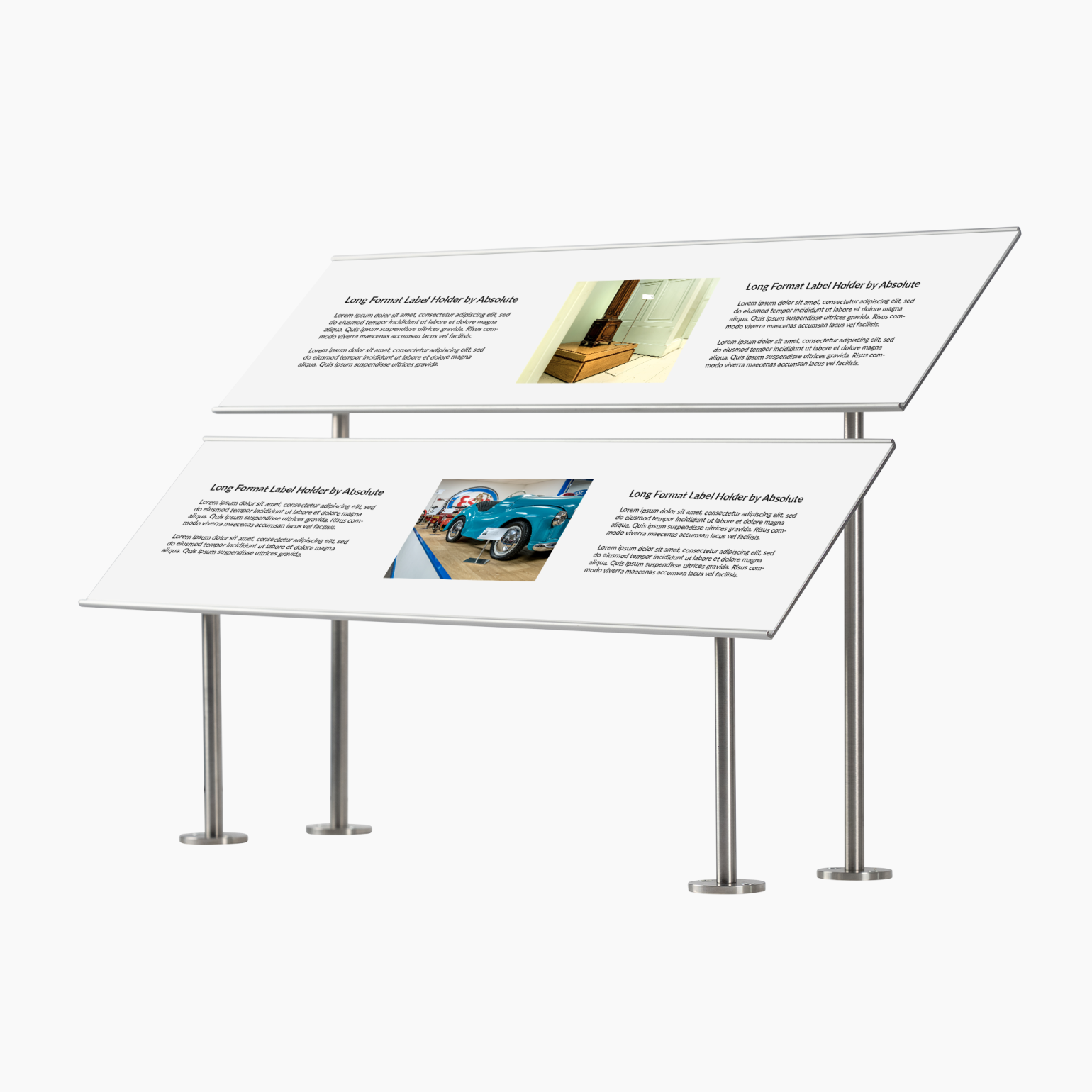 - Format long – Conçu pour les textes explicatifs longs et les affichages multilingues. Peut être produit en version autonome, à montage en surface ou mural.